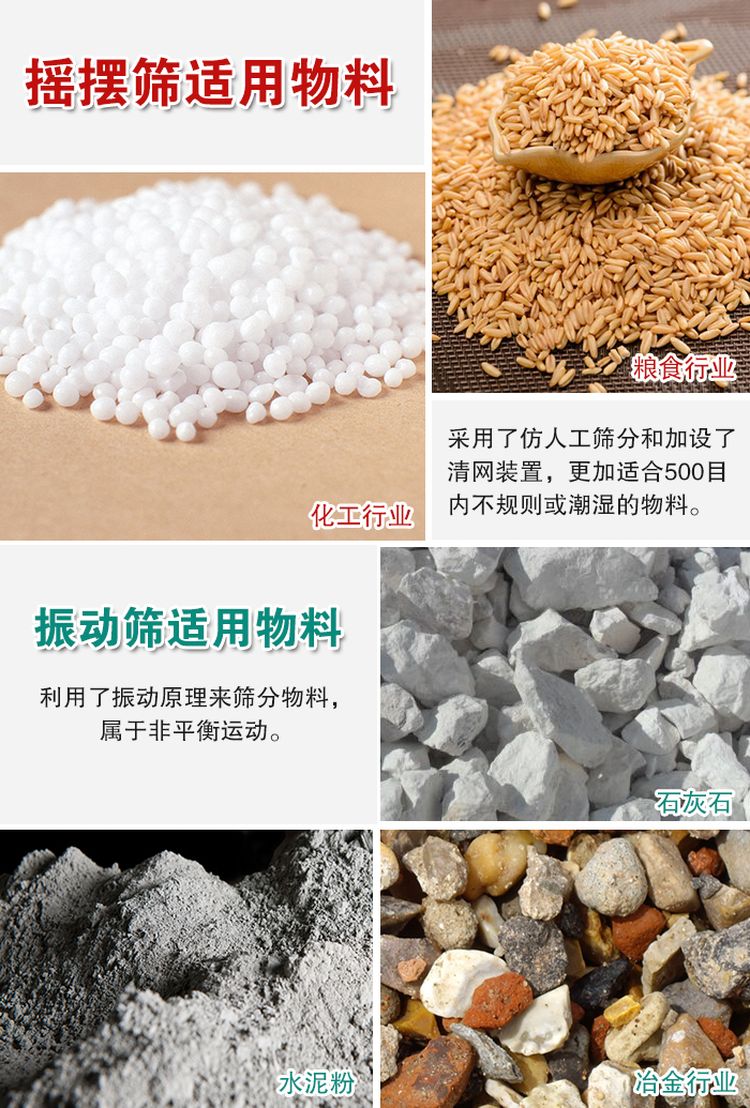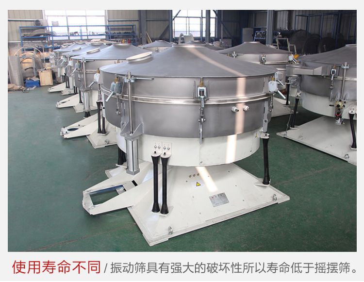 搖擺篩由于采用了仿人工篩分和加設(shè)了清網(wǎng)裝置,所以更加適合500目內(nèi)不規(guī)則或潮濕的物料,克服了普通振動(dòng)篩的堵網(wǎng)風(fēng)險(xiǎn),而振動(dòng)篩屬于非平衡破壞暴力運(yùn)動(dòng),利用了振動(dòng)原理來篩分物料,所以有時(shí)還會破壞物料,所以對于一些顆粒狀結(jié)晶焦脆物料,建議使用搖擺篩,其篩分精度可達(dá)95% 以上。