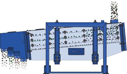 設(shè)備的篩箱在慣性力的作用下作前后往復(fù)運動,并帶動篩面做周期性搖動,迫使篩面上的物料隨篩箱一同做定向跳躍式運動,小于篩面孔徑的物料通過篩框落到下層,稱為篩下物,大于篩面孔徑的物料經(jīng)連續(xù)翻滾跳躍運動后從排料口排出,完成篩分作業(yè)。
