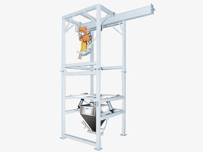 噸包投料站又稱噸袋拆包機(jī),是用來實現(xiàn)袋裝散裝物料的卸料功能,為半自動操作。包裝袋由電動葫蘆提升,包裝袋的袋繩掛在鋼性支架上,手動操作控制葫蘆升降和行走,沿著行走導(dǎo)軌運(yùn)行到卸料區(qū)上方落下,將包裝袋放置在支架托盤上,使大袋處于卸料位置。然后手動打開卸料閥操作門,人工將包裝袋的卸料口拉入到卸料閥的系口出,按下系帶按鈕,卸料閥束緊氣缸將袋口鎖緊,再手動將大袋的卸料口從卸料位置拉下,罩在卸料口密封箱內(nèi)的出料管外側(cè),按下壓袋機(jī)構(gòu)氣動控制開關(guān),使密封法蘭下降,并緊壓在出料管的管端,密封卸料通道,以防卸料過程中粉塵漏,接著,人工解袋,關(guān)上操作門。手動開啟與卸料口密封箱連接的通風(fēng)除塵管道上的閥門。至此,卸料準(zhǔn)備過程結(jié)束。
