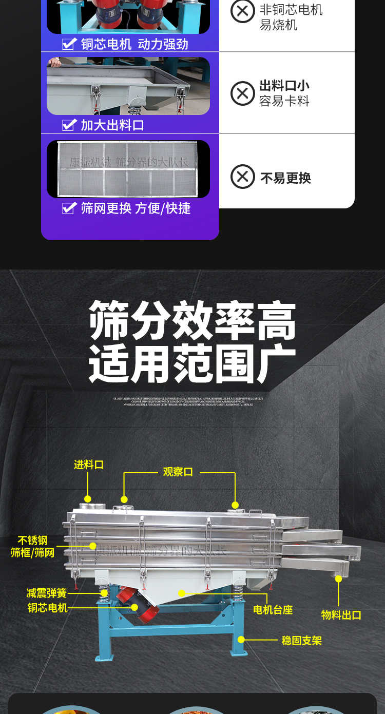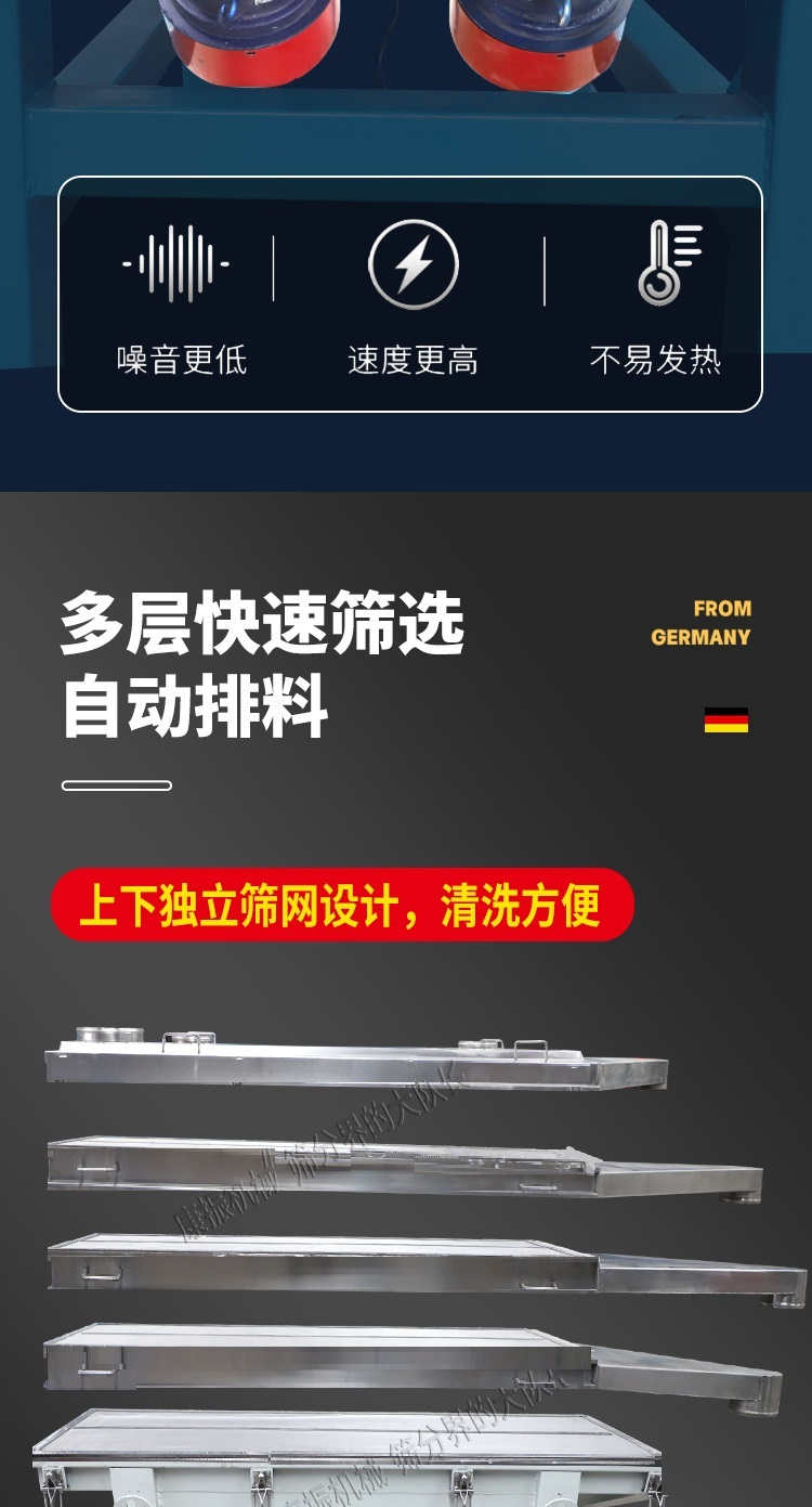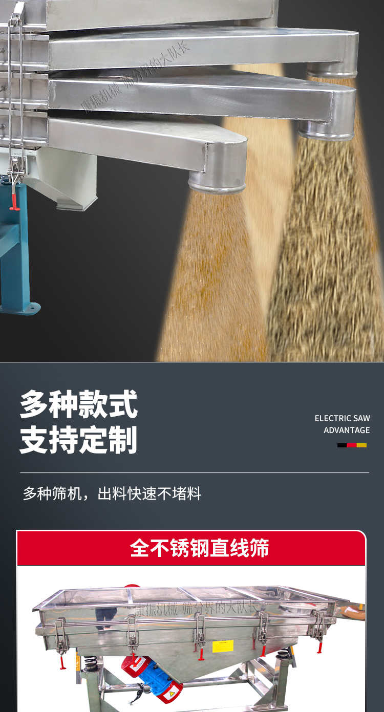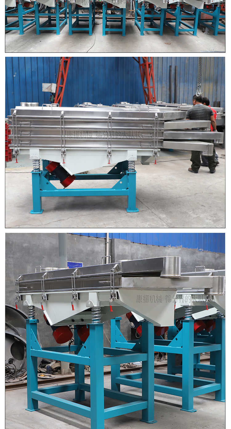 是以利用振動電機激振作為振動源,使物料在篩網(wǎng)上被拋起,同時受力向前做直線規(guī)則運動,物料從給料機均勻地進入篩分機的進料口,通過多層篩網(wǎng)產(chǎn)生數(shù)種規(guī)格的篩上物、篩下物、從各自的出口排出。具有耗能低、產(chǎn)量高、結(jié)構(gòu)簡單、易維修、全封閉結(jié)構(gòu),無粉塵溢散,自動排料, 更適合于高產(chǎn)能流水線作業(yè)。