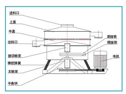 搖擺篩主要由振動(dòng)電機(jī)、篩網(wǎng)、承重裝置、搖擺錘、拉簧、底座等部分組成。