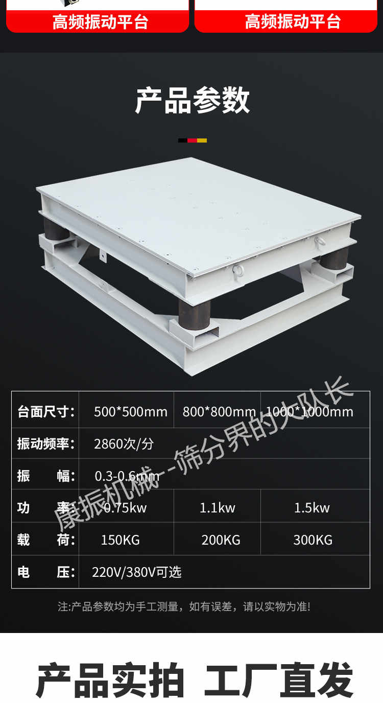 ◆大功率、大臺面;功率可大7.5kw,激振力80KN,可承載10T。